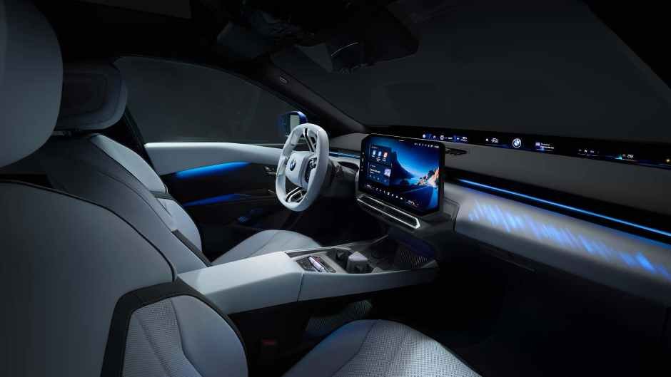 Yeni elektrik sedanının salonu demək olar ki, iX3 ilə eynidir. Sedan multimedia sisteminin 17,9 düymlük əyri sensorlu ekranı olan futuristik ön panelə, ön şüşənin altındakı Panoramic iDrive displeyinə və çoxfunksiyalı dördqollu sükan çarxına malikdir. Bütün elementlərin qarşılıqlı işinə BMW Operating System X əməliyyat sistemi cavabdehdir. Əlavə ödəniş qarşılığında 3D proyeksiya ekranını quraşdırmaq olar. Üstü açıq mərkəzi tuneldə bucaqlı stəkan tutacaqları, simsiz şarj paneli və transmissiyanın düyməli selektoru yerləşir. Avtomobilin funksiyalarının səslə idarə edilməsi, süni intellektə əsaslanan yenilənmiş Amazon Alexa+ sisteminə həvalə olunub.