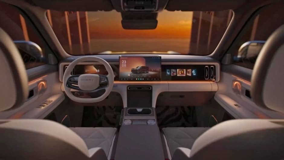Ön paneldə cihaz paneli, media sistemi və ön sərnişin üçün nəzərdə tutulmuş üç displey yerləşir. Mərkəzi konsolda simsiz şarj meydançaları, stəkan tutacaqları və iki fırlanan dəstəyi olan fiziki düymələr bloku var. Ümumi plandan göründüyü kimi, Tiggo X modeli orta cərgədə üç nəfərlik divan olan yeddi nəfərlik salona malikdir.