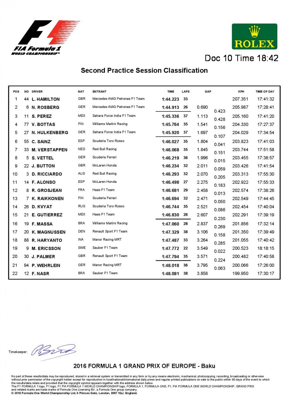 Səhərki zamanını iki saniyə yaxşılaşdıran Britaniyalı pilot, komanda yoldaşını 0,690 saniyə üstələmiş oldu. Qeyd etmək lazımdır ki, protokoldan da göründüyü kimi, sərbəst yürüşlərdə Mercedes mühərrikləri ilə təchiz edilmiş bolidlər digərlərinə nisbətən daha yaxşı nəticələr göstərmişlər.