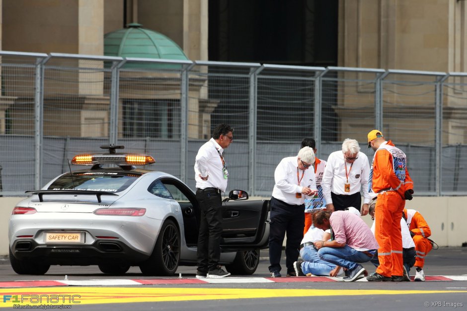 Bakıda keçirilən Avropa Qran Prisinin bu gün keçirilən sərbəst yürüşlərinin ikinci hissəsinin, günün birinci hissəsində keçirilmiş yürüşlərə nisbətən sakit keçdiyini söyləmək olar. Lakin, birinci sessiyadan sonra bütün bolidlərin sol arxa təkərlərinin zədə aldığı aşkarlanmışdı. Sən demə, bu zədəni döngələrin birindəki dəmir porebrikləri asfalta bərkidən boltların yük altında tədricən açılması səbəb olmuşdur.