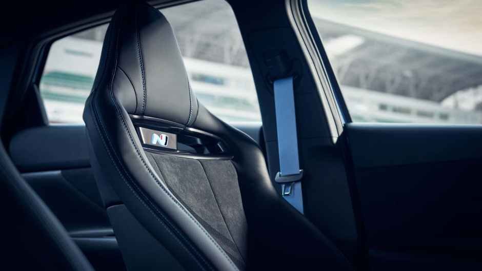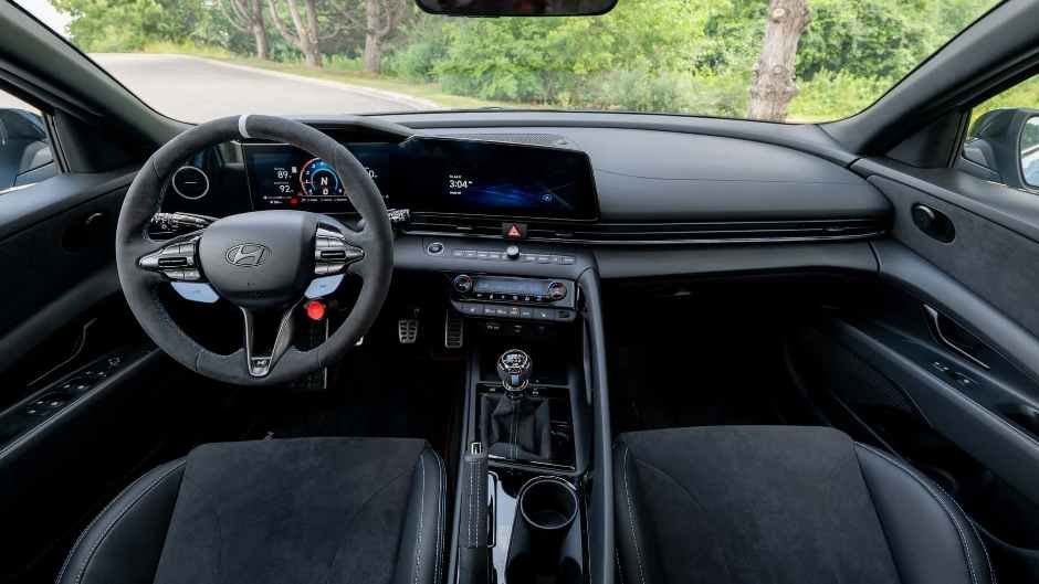 Hyundai Elantra N TCR xüsusi buraxılışının interyer tərtibatında alkantaradan bolluca istifadə olunub - oturacaqlar, transmissiyanın və əl əyləcinin dəstəyindəki əlavələr bu materialdandır.