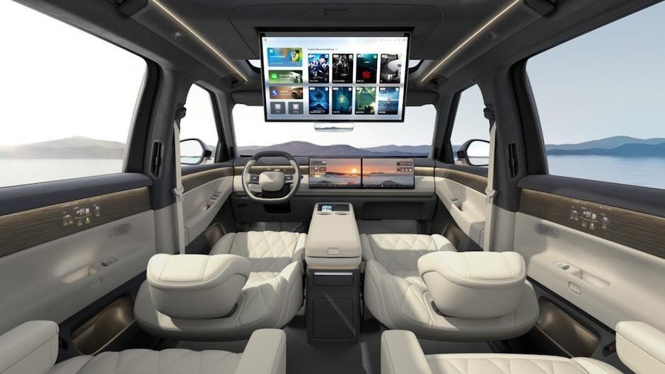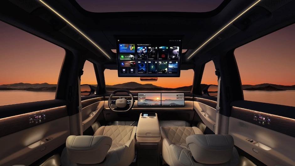 Ön paneldə iki 15,6 düymlük multimedia ekranı var, tavanda isə, arxa sərnişinlər üçün nəzərdə tutulmuş qatlanan 21,4 düymlük monitor yerləşir. Sürücünün önündə cihaz panelinin displeyi yoxdur və onun funksiyaları süni intellekt elementləri olan kiçik proyeksiya ekranına həvalə edilib. Qabaqcıl naviqasiya sistemi də vəd edilib.